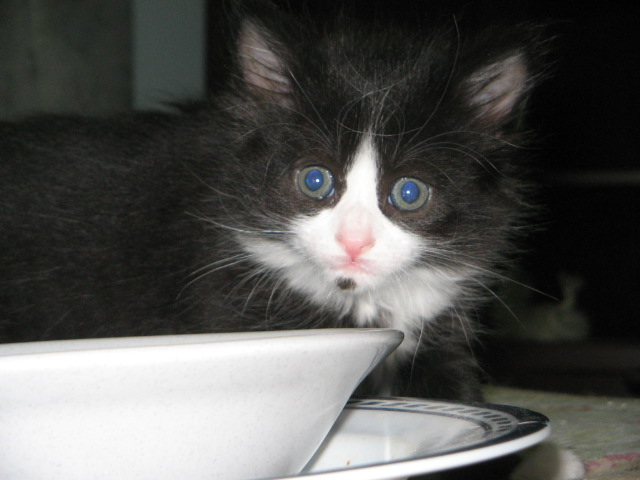 Daisy was not the largest kitten at first, but during her short life she underwent a growth spurt and outpaced the others. She developed muscles and agility, quickly acquiring the skills necessary to leap onto the highest furniture in the house, making seemingly impossible jumps with almost no effort whatsoever. Her beautiful coat shown smartly as she gracefully went about her affairs; she was the picture of health. She also appeared to be making friends with one of our adult cats, Cleo, a tortie. Cleo was not fond of the kittens; but this black and white little girl busily chipped away at the layers of resistance, working her way into Cleo’s heart. It could be because of Daisy’s resemblance to our Chatterbox, a tuxedo cat who passed away on October, 2010, whom Cleo loved; but we cannot say for certain.