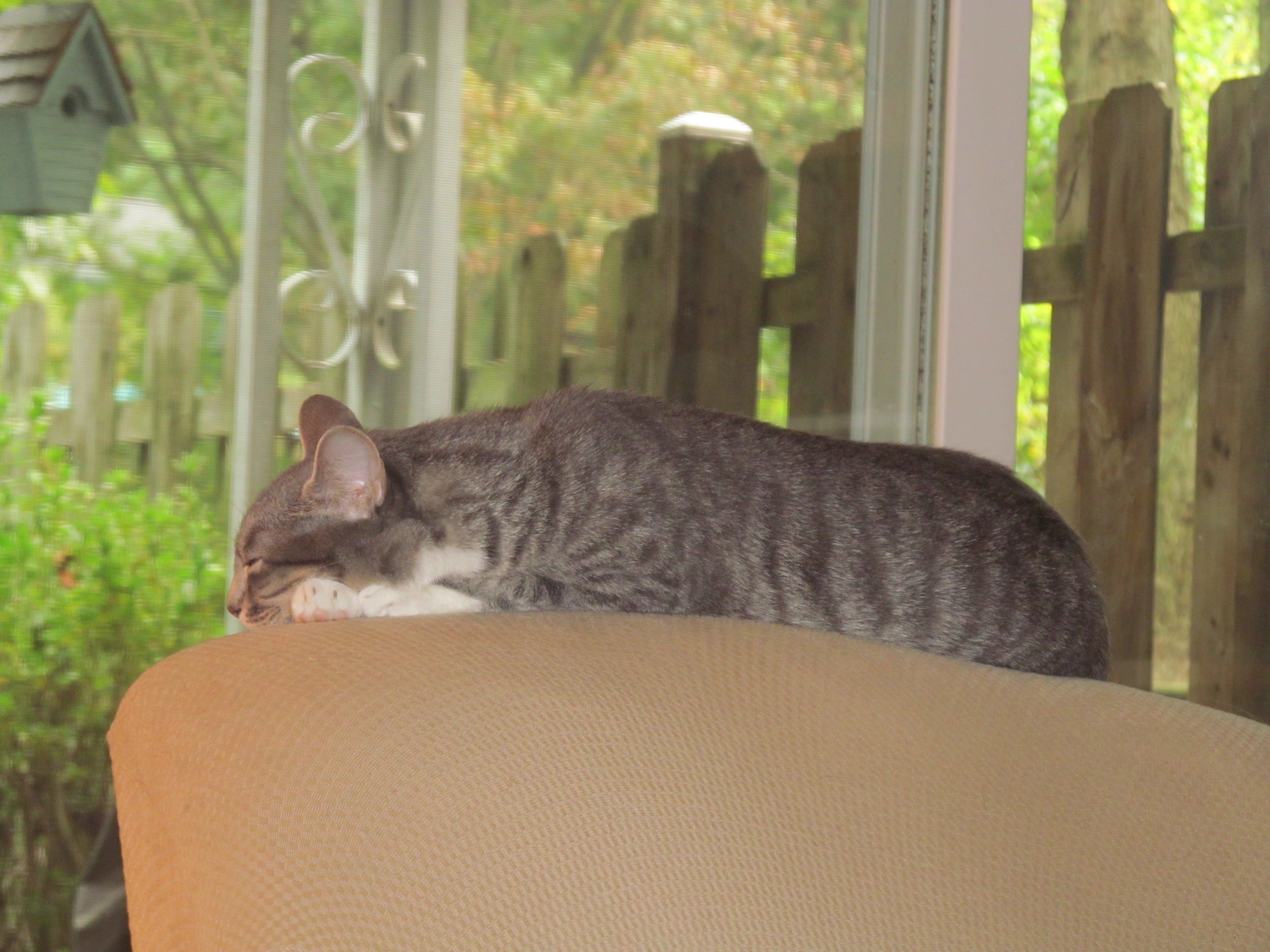 When the kittens were small, we kept Carrie and them in our guest bedroom. Lily was the first of the kittens to attempt to sneak out, quietly slinking by Marcia when she was carrying food dishes out. One day I went into our guest bathroom, and suddenly I noticed a little grey puff-ball walking in. “What are you doing here?” I asked her. I put her back into the room, so she could tell her sisters all about her adventure.