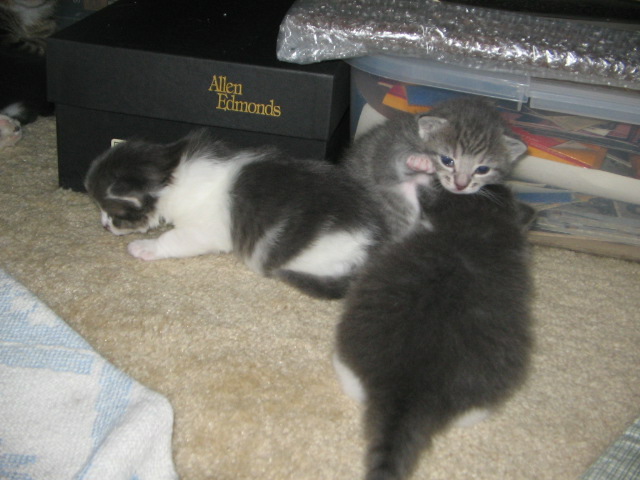 In short order, this all fell apart. The people involved who had wanted kittens backed off, and this left us with the original idea of perhaps taking to the no-kill shelter. Naturally, our resolution to avoid developing close ties with the kittens didn’t last long at all; they worked their magic on us and grabbed our hearts, quickly reeling us in.
