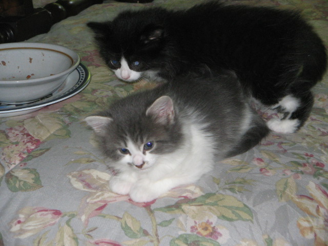 When Marcia went up to our guest bedroom with Carrie’s supper on April 5th, 2012, Carrie didn’t immediately rush out from under the bed as had been her custom. Instead, on this evening, Marcia heard some high-pitched mewing, and peering under the bed, spied three kittens. Later when Marcia returned to the room, there was a fourth kitten who had joined the litter, a little grey and white kitten. Of course this one eventually became Lovey.